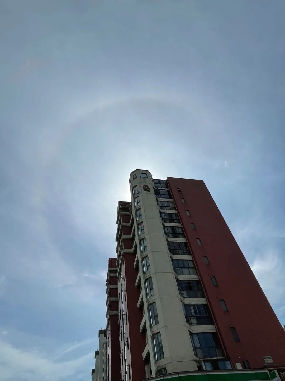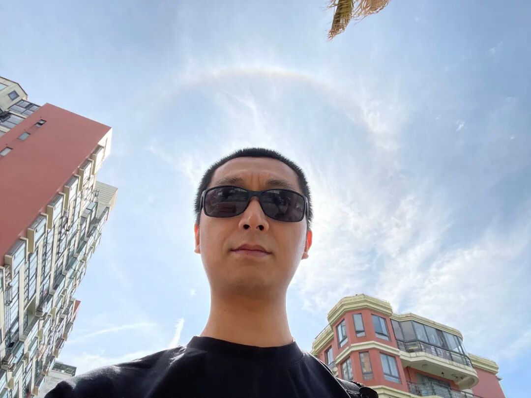 如果彩晕一时半会儿没消失,你还可以考虑考虑自拍,把自己拍进去作为留念。方法是,打开手机的正面相机,想办法让自己的脑袋或者手指挡住太阳。然后拍照。你可能会得到像是这样的照片。